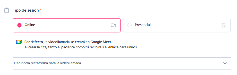 Online: Si eliges esta opción, se generará automáticamente un enlace de Google Meet.