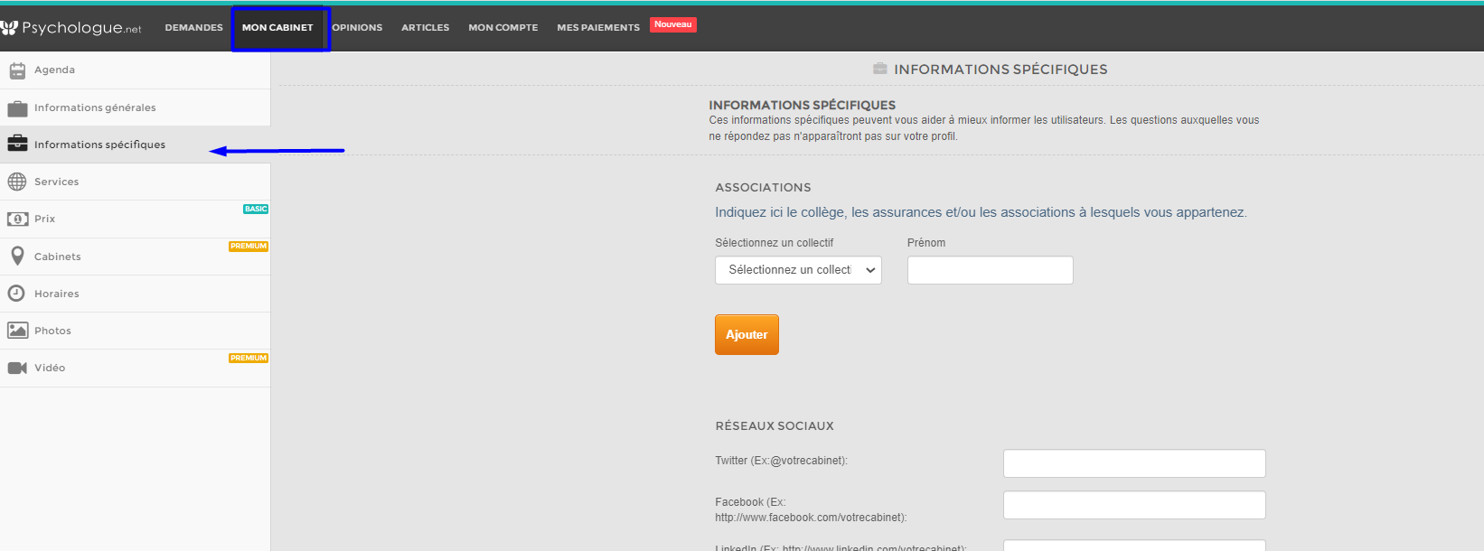 Pour remplir vos Informations spécifiques, cliquez sur Mon Cabinet>Informations Spécifiques et répondez aux questions posées. Les questions auxquelles vous ne répondrez pas n’apparaîtront pas sur votre profil.