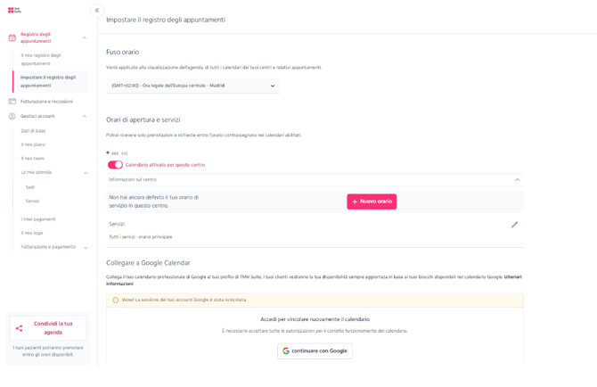 Da lì potrà definire i suoi orari disponibili per ogni calendario. Questo le permette di avere orari personalizzati e servizi differenziati in base a ogni centro o professionista.