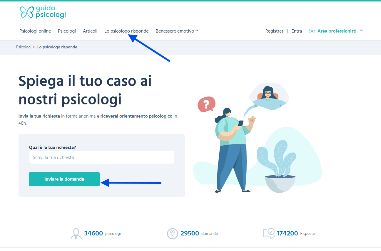 Devi andare nella sezione Lo psicologo risponde ed esporre il tuo dubbio dando il maggior numero possibile di dettagli affinché possa essere risolto dagli esperti del portale. Riceverai una mail quando un esperto ti risponde.