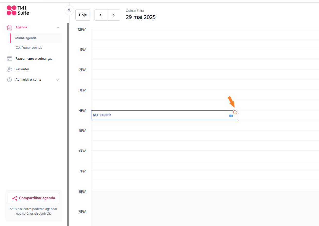 Você também poderá visualizar a consulta acessando diretamente sua agenda no Suite; ela aparecerá com um ícone de aviso indicando que está pendente de confirmação.