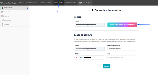Para modificar a contrasenha de acesso ao seu espaço, vá ao menu profissional de mundopsicologos.com.