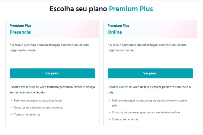 Premium Plus Online: seu perfil aparece em um diretório com visibilidade nacional, permitindo que você alcance pessoas de todo o país, inclusive do exterior, que buscam terapia online.
