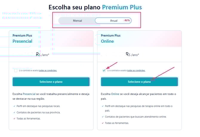 Escolha o plano que melhor se adapta a você (mensal ou anual) e clique em “Selecionar” para continuar.